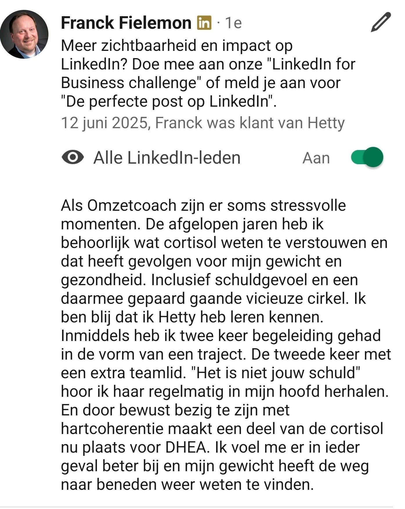 Het motiveert mij om door te gaan en het versterkt ook de banden met anderen. Elke positieve aanbeveling is een extra duwtje in de rug om nog beter te worden en verder te groeien.
