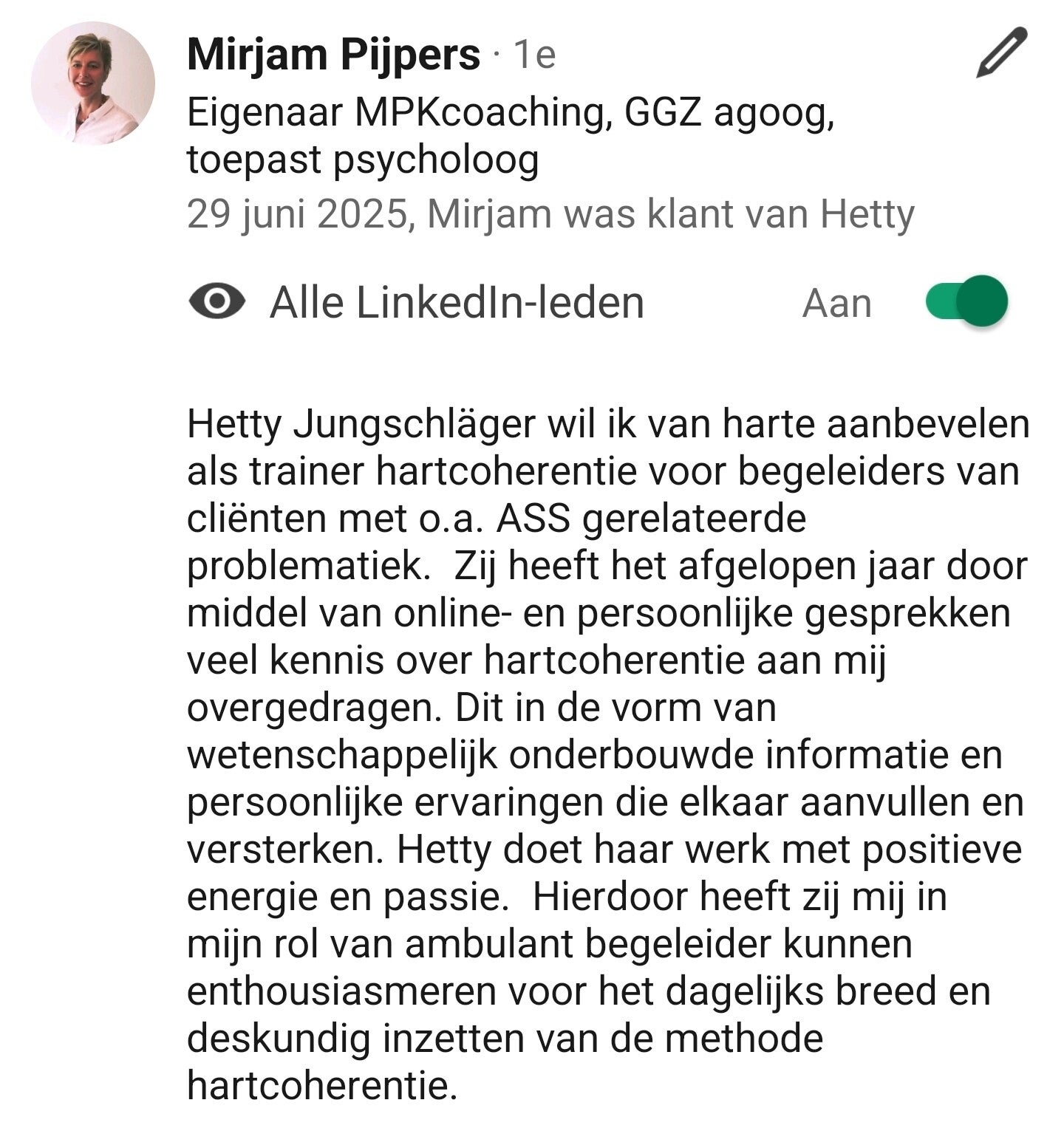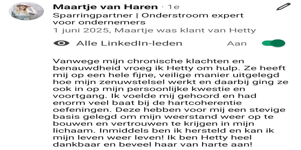 Het ontvangen van een (geschreven) aanbeveling voelt altijd goed. Het is een teken dat mijn werk gewaardeerd wordt en dat anderen mijn inzet opmerken. Het geeft een gevoel van bevestiging dat ik op de goede weg ben.
